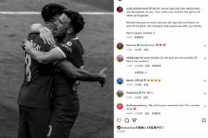 体育资讯7月3日讯 利物浦前锋若塔因车祸不幸离世,队友索博斯洛伊也在社媒晒出两人昔日合照悼念。